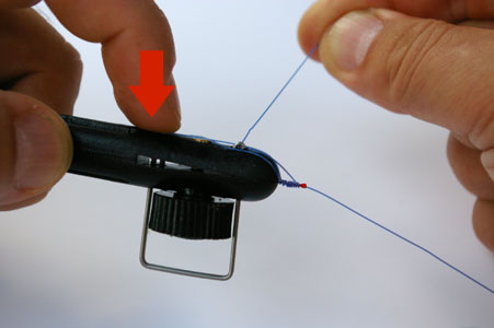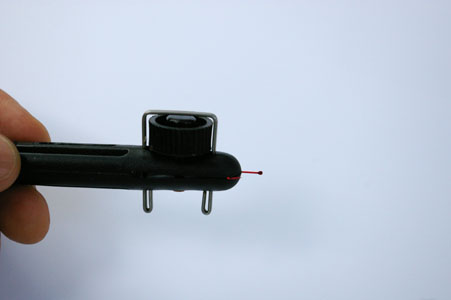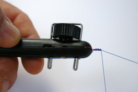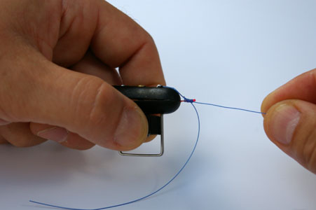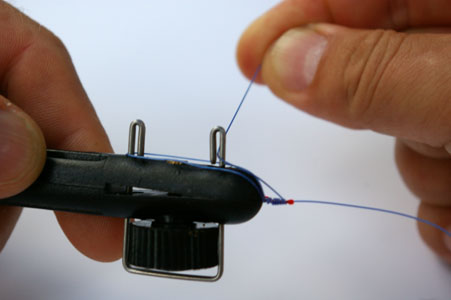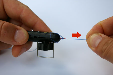 Die Schnur (am besten direkt von einer Spule) um den hinteren Bügel legen und wieder nach vorn zum eingeklemmten Hakenschenkel führen. Jetzt den Matchman drehen und dabei das kurze Ende der Schnur fest halten und bei jeder Drehung etwas weiter in Richtung des Plättchens führen, so dass eine saubere Wicklung entsteht. |