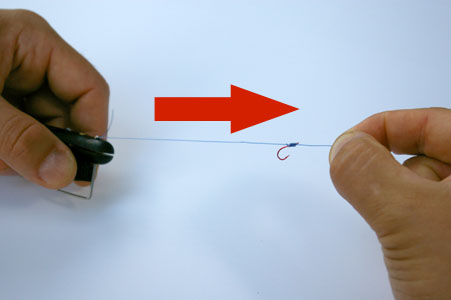 Den Haken so weit an der Schnur vom Matchman weg ziehen, bis auch das kurze Ende der Schnur komplett aus dem Bügel des Matchman herausgezogen ist. |