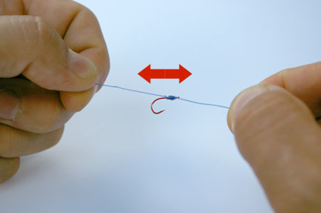 Jetzt nochmals die Schnur an beiden Seiten des Hakens fest ziehen und das kurze Ende abschneiden. Fertig. |